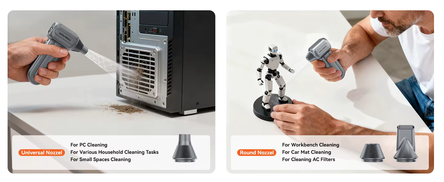עוצמת ניקוי של 110,000 סל"ד: מצויד במנוע Brushless (ללא פחמים) המגיע למהירות של עד 110,000 סל"ד בהילוך השלישי. המפוח מסלק אבק פצפון ופירורים ממקלדות, מארזי מחשב ומאווררי קירור. הקונספט: "דקה של תחזוקה, 10 דקות של ניקוי עמוק" – אידיאלי לגיימרים וחובבי טכנולוגיה.