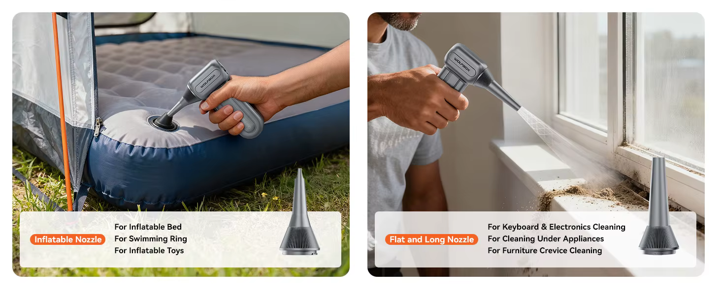 השקעה חסכונית ורב-פעמית: מחליף את מכלי האוויר הדחוס החד-פעמיים שנגמרים מהר וקופאים בזמן השימוש. המפוח האלחוטי נטען ומיועד לשימוש חוזר, מה שחוסך כסף לטווח הארוך ושומר על הסביבה. שותף בר-קיימא לניקוי מוצרי חשמל, משטחים בבית וגאדג'טים עדינים.